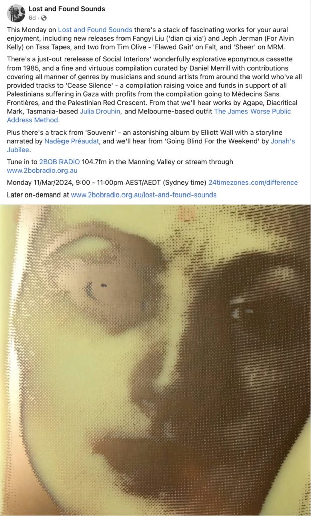 My audio tour “Souvenir” was just featured on Lost and Found Sounds, experimental music on 2BOB FM 104.7FM Radio, Sydney, Australia. Hamish, the host, calls the album “astonishing”… I never sent him a promo, and I had never known him or the show until now. So it would be wildly understating it to say that I’m absolutely blown away and humbled that someone appreciates my efforts and is willing to broadcast over ~5 kilowatts. Thank you, Hamish!
