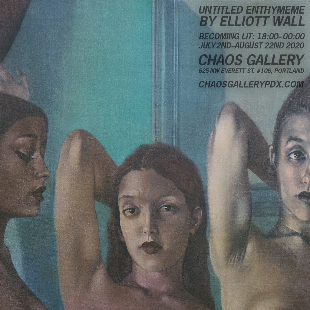 Untitled Enthymeme, Chaos Gallery, July—August, 2020 Posted on 2020-07-052025-10-30 by Elliott Untitled Enthymeme by Elliott Wall, July 2—August 23 at Chaos Gallery, Portland, OR, US “In love all the contradictions of existence merge themselves and are lost.”—Tagore
